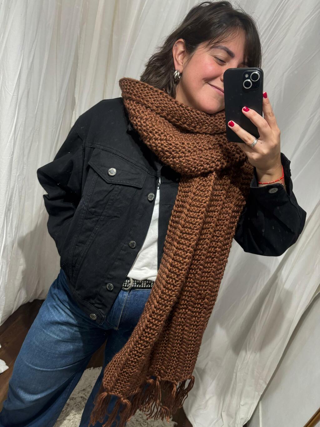 Maxi bufanda tejida a mano con un diseño de bastones a lo largo, elaborada con hilado grueso de lana que te ofrece una calidez excepcional. Sus flecos en los extremos añaden un detalle distintivo.
